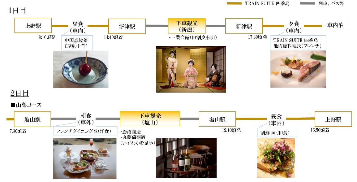 「1泊2日コース(山梨)/秋」は、「みなとまちが育んだ豪商の粋と、豊かな里山の恵みを味わう旅。」をテーマに、上野駅を出発し、新潟県と山梨県を巡ります。