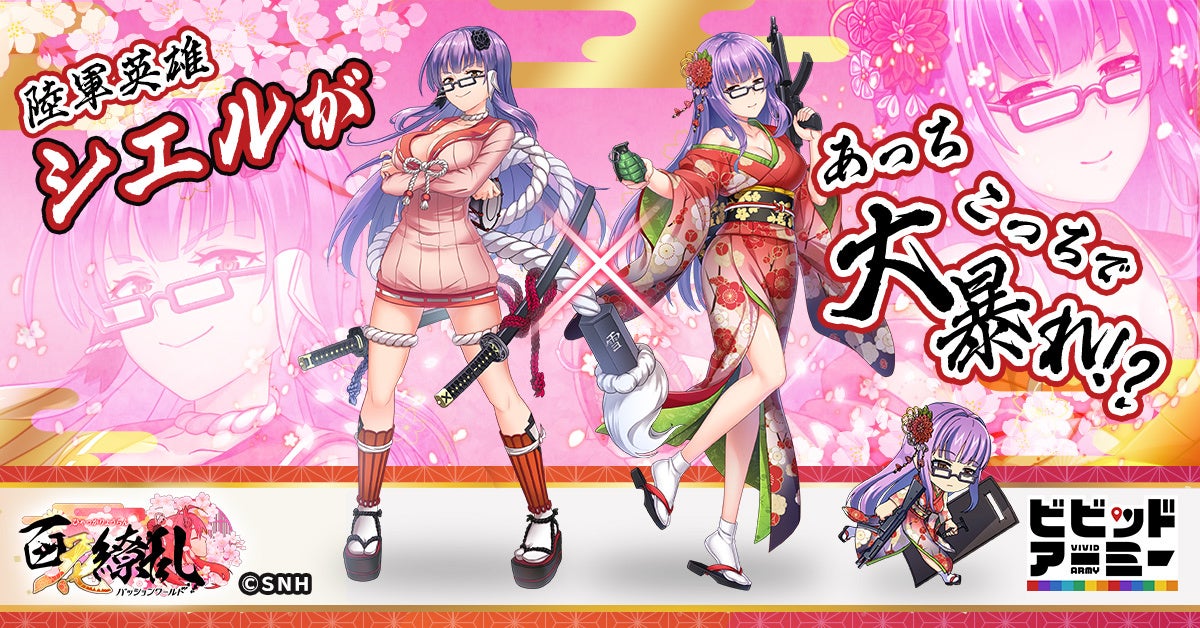 ビビッドアーミーでは、柳生十兵衛の衣装を着た「シエル」の限定スキン、「柳生十兵衛」「徳川千」「真田幸村」のキャラスキンが登場します。さらに、百花繚乱パッションワールドでは、和服姿の「シエル」がマシンガンを携え新たな剣姫として参戦します。