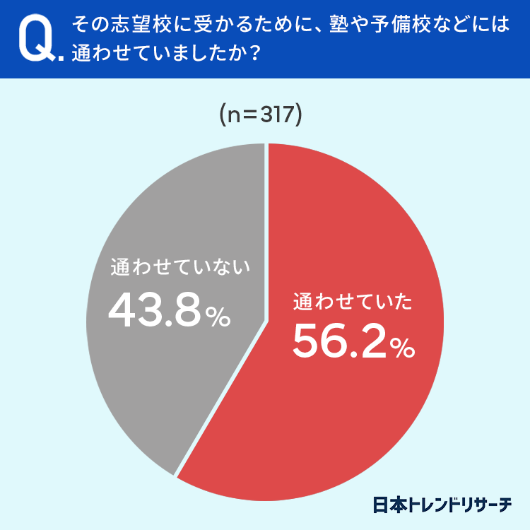 56.2%の方がその志望校に受かるために、塾や予備校などに「通わせていた」と回答しています。