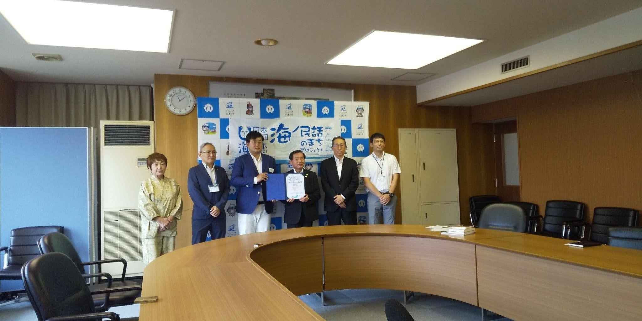 日本中に残された海にまつわる民話を発掘し、その民話のストーリーと、そこに込められた「想い」「警鐘」「教訓」を、親しみやすいアニメーションとして映像化します。当日は、認定委員長をはじめとする事務局メンバーが「海ノ民話のまち」として認定した15のエリアのうちの1つである長野県大町市の牛越徹市長を表敬訪問し、「海ノ民話のまち」認定証贈呈式を行いました。