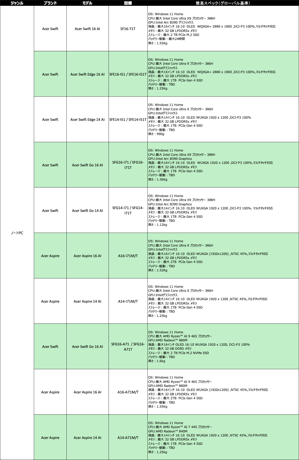 Aspire AIシリーズの各モデルは、最大 32GB メモリ と最大 2TB PCIe Gen4 SSD を搭載可能。ディスプレイには、16:10アスペクト比のWUXGAディスプレイを採用し、最大 120Hzのリフレッシュレートに対応。タッチ対応/非対応モデルに加え、OLEDパネルも選択可能です。