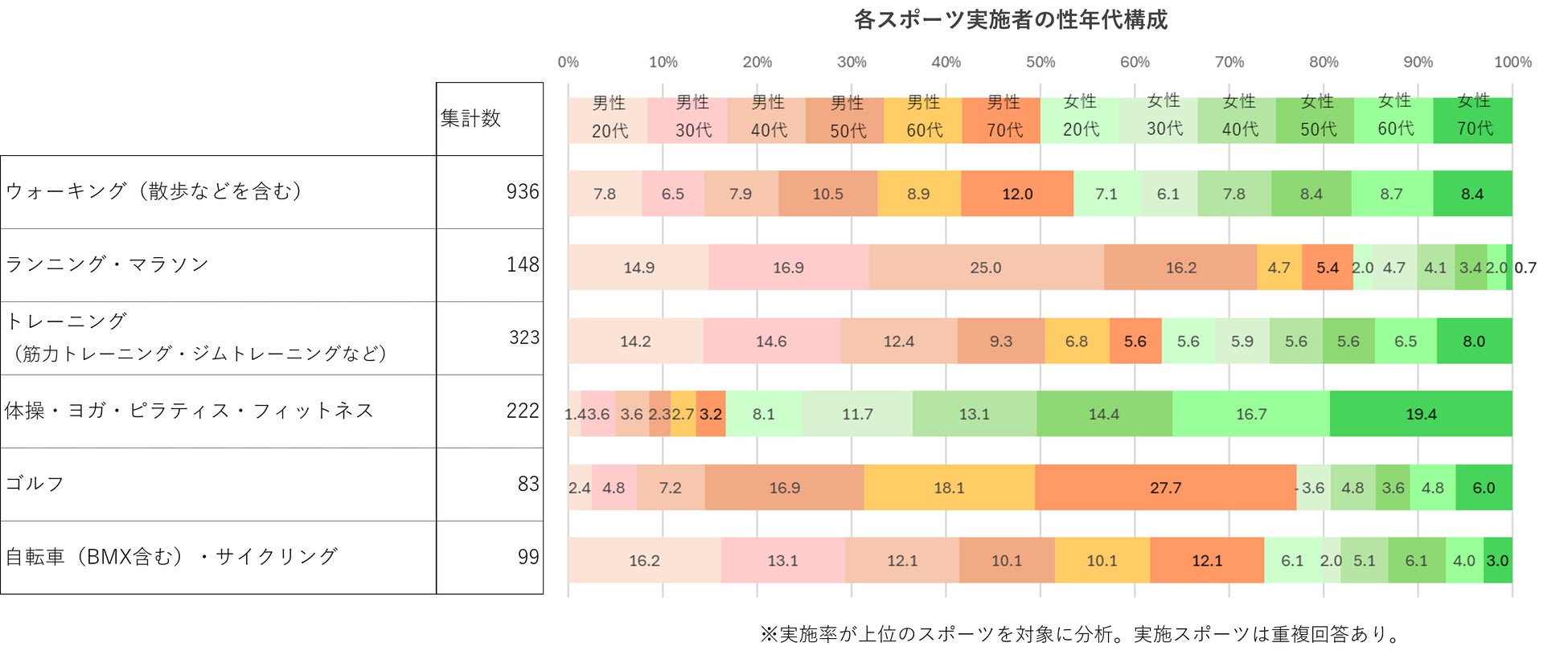 「ウォーキング」実施者の性別は男女ほぼ半数ずつで、やや男性70代の構成比が高いものの、一部の性年代への極端な偏りは見られません。「ランニング・マラソン」「ゴルフ」「自転車(BMX含む)・サイクリング」は男性の比率が高く、「ゴルフ」は男性50代~70代でゴルフ実施者全体の6割を占めています。「体操・ヨガ・ピラティス・フィットネス」の実施者は女性が8割を超えています。各スポーツで性年代が異なることが分かります。