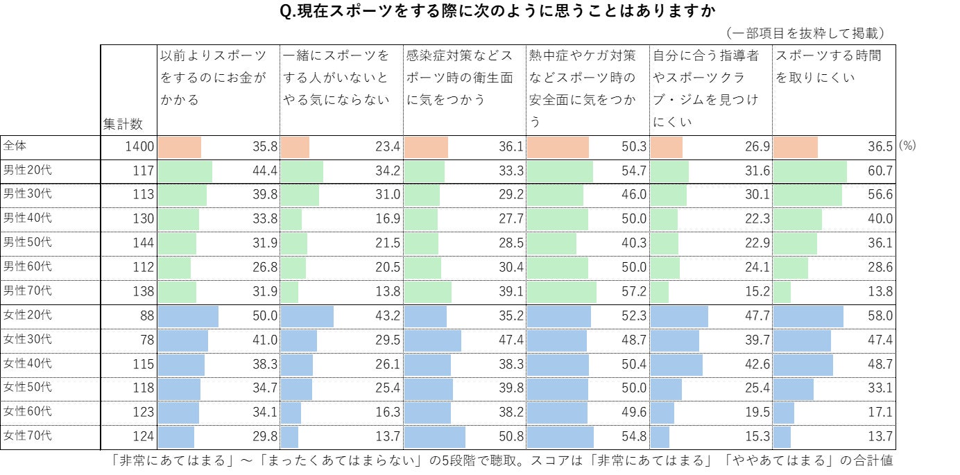 性年代別に見ると、「スポーツする時間を取りにくい」「以前よりスポーツをするのにお金がかかる」など複数の項目は男女それぞれで20代が最も高くなっており、スポーツをするのに悩みや問題点を感じることが多いようです。70代男女では、「熱中症やケガ対策などスポーツ時の安全面に気をつかう」「感染症対策などスポーツ時の衛生面に気をつかう」など実施環境を気にしている方が多いという結果になりました。「自分に合う指導者やスポーツクラブ・ジムを見つけにくい」は、全体では26.9%、男性は20~30代、女性は20~40代で3割以上の回答が見られました。