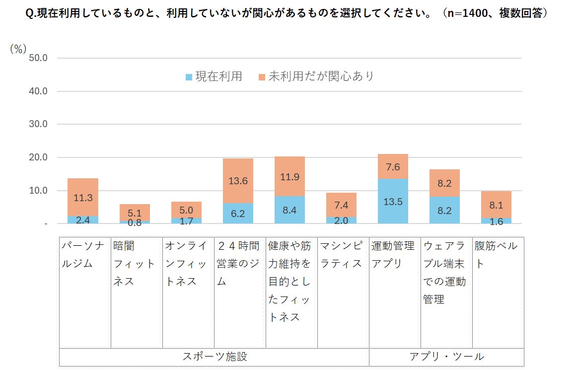 最近は施設や運動メニューなどに独自の特徴を持ったジムや目標達成をサポートしてくれるアプリなど、運動に関連する様々なサービスが出てきています。そこで、スポーツ施設やツールの利用状況と関心度について尋ねました。