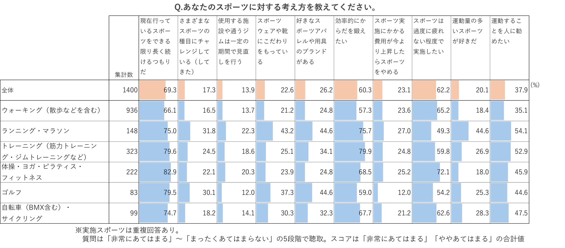 「スポーツウェアや靴にこだわりをもっている」「好きなスポーツアパレルや用具のブランドがある」の2つに焦点を当て、実施スポーツ別で見ると、「ランニング・マラソン」「ゴルフ」は他のスポーツよりもウェアやブランドに関心が高い結果となっています。また、「効率的にからだを鍛えたい」では「ランニング・マラソン」「トレーニング」で7割を超える結果となりました。