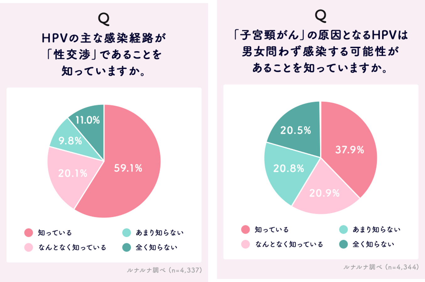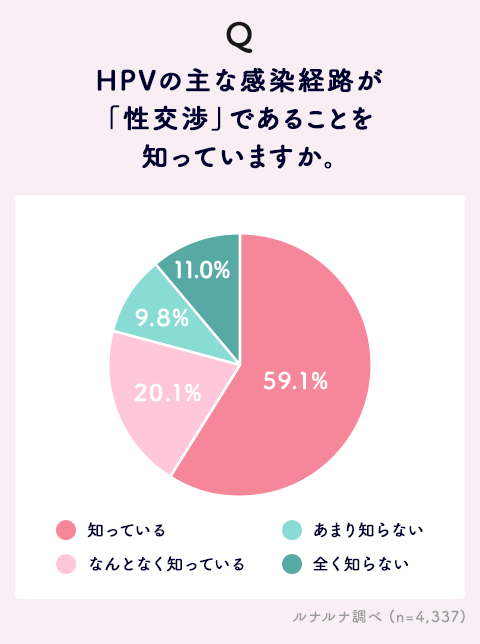 まずHPVの主な感染経路が性交渉であることを知っているかをたずねると、「知っている」59.1%、「なんとなく知っている」20.1%となり、合わせると8割近い人が正しく理解している結果となりました。