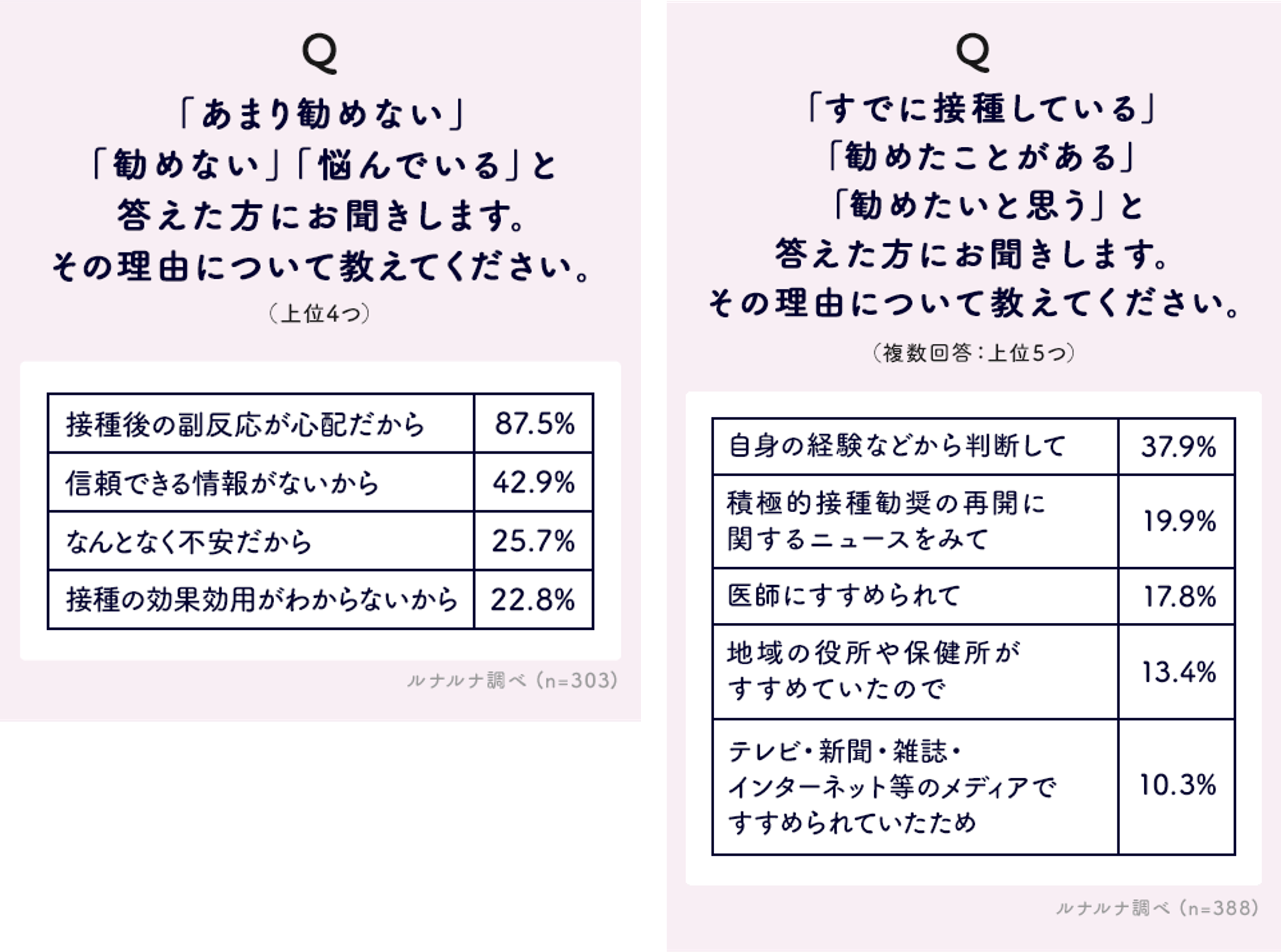 HPVワクチンに関しては女性同士でも様々な意見があり、今回の調査でも多くの自由回答が寄せられました。なぜワクチン接種に前向きなのか、あるいは慎重なのか、女性たちの生の声の一部を紹介します。