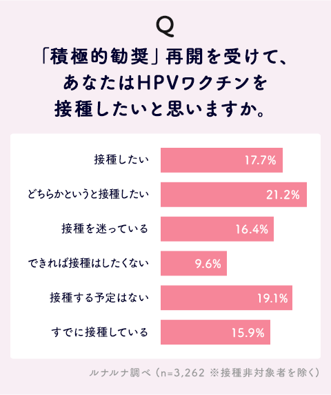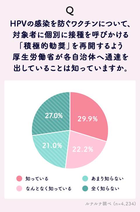 Q. HPVの感染を防ぐワクチンについて、対象者に個別に接種を呼びかける「積極的勧奨」を再開するよう厚生労働省が各自治体へ通達を出していることは知っていますか。