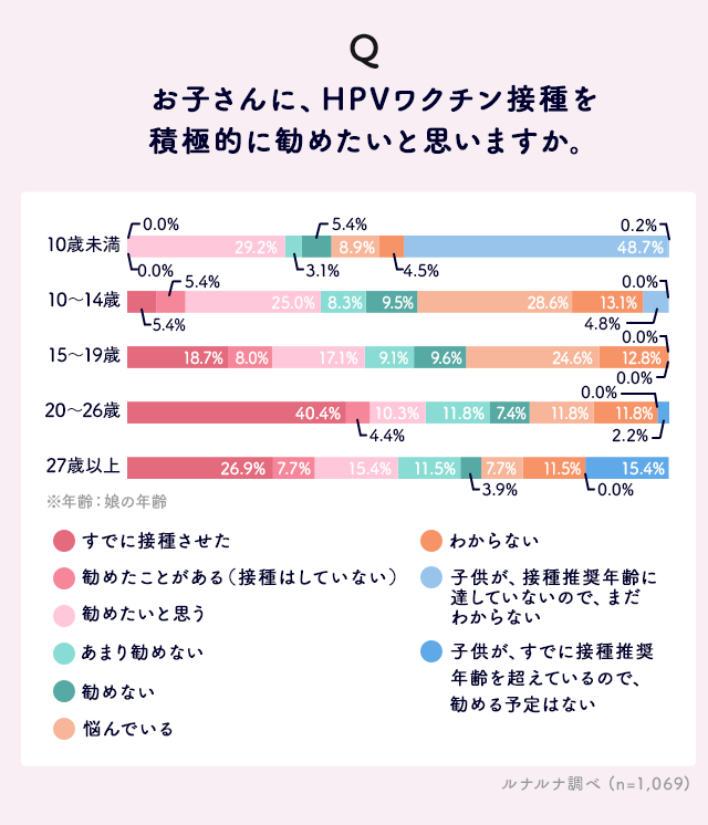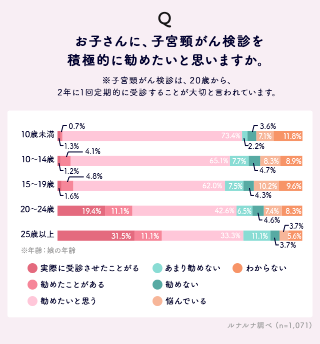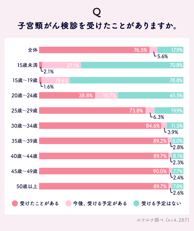 子どもに子宮頸がん検診を勧めたいかの質問では、子どもの年齢(複数いる場合は長子の年齢で回答)によって差はあるものの、各世代とも「勧めたいと思う」が最も多い結果となり、子どもが将来がんに罹患するリスクを下げようと考えている母親たちの想いがみえ、安心するとともに嬉しくなりました。また、ルナルナユーザーの子宮がん検診の受診率は、全体で76.5%となり、30代以降は8割を超える結果となりました。