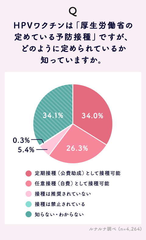 続いて、HPVワクチンの認知について聞いてみました。現在HPVワクチンの接種は、小学校6年生から高校1年生に相当する女子であれば定期接種(公費助成)として接種が可能ですが、どのように受けられるかについて「知らない・わからない」と答えた人が34.1%と、最も多い結果となりました。