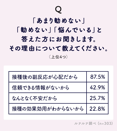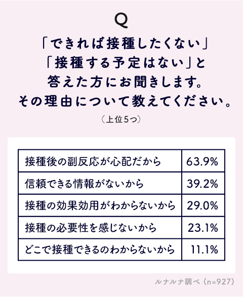Q. 「できれば接種したくない」「接種する予定はない」と答えた方にお聞きします。その理由について教えてください。(複数回答可:上位5つ)