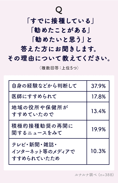 「すでに接種している」、「勧めたことがある」「勧めたいと思う」と回答した母親を対象にその理由を聞くと、「自身の経験などから判断して」37.9%が最も多く、娘の接種には母親の経験がもととなるケースが多いことが分かります。