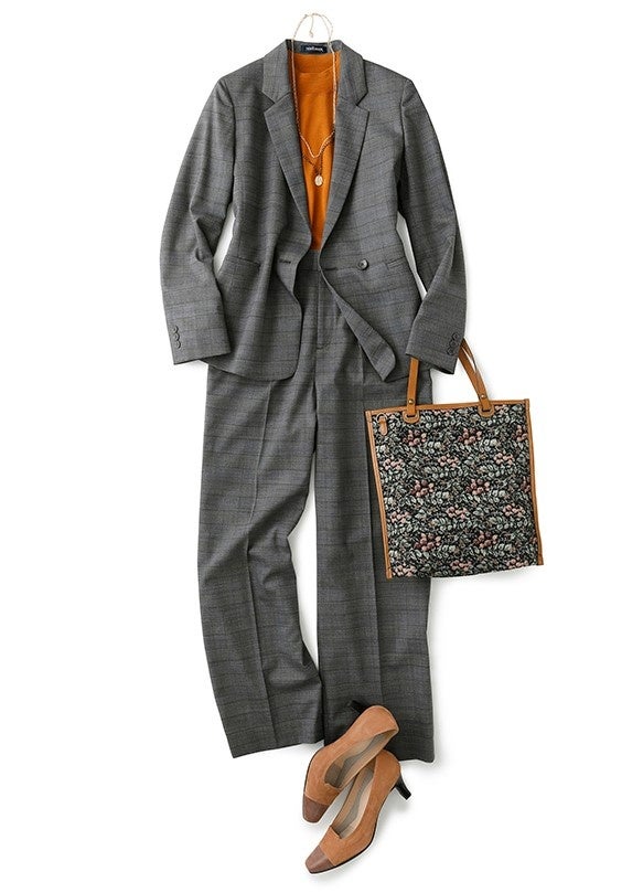 冬まであと少し、でもコートにはまだ早い。そんな11月にはインナーを冬素材のウールにチェンジ!アイキャッチとなる鮮やかなオレンジカラーで、セットアップスタイルもより華やかな印象に。