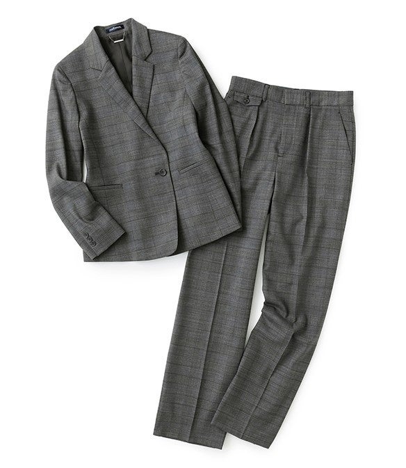 秋らしさを感じる、グレンチェック柄のセットアップ。1つ釦のセミダブルジャケットは、片玉縁ポケットと程よいシェイプの3面体シルエットが柔らかい印象です。反対に、センタープレス入りの9分丈ストレートパンツは、フラップ付のコインポケットがメンズライクでハンサムなアイテム。上下の絶妙なバランスが、より大人の上品さを演出してくれます。