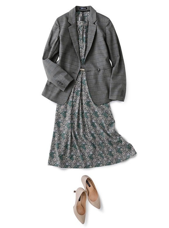 朝晩の気温差に秋らしさを感じる頃。温度調節だけでなく、きちんと感も演出できるジャケットは頼もしいアイテム。1枚でサマになるレディライクな総柄ドレスも、ジャケット効果でより知的な表情に。