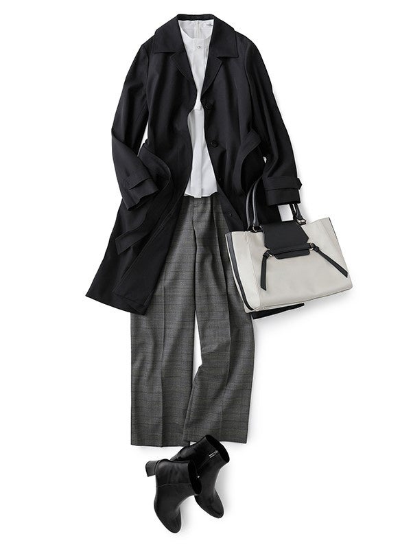本格的な秋到来で、日中は過ごしやすい気温に。カットソーを軸に、薄手のロングコートとショートブーツを合わせて秋らしさを演出。モノトーンとグレンチェックが大人の上品さを後押ししてくれます。