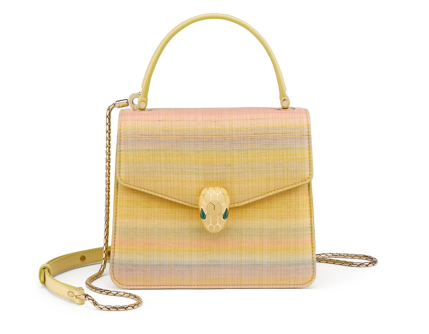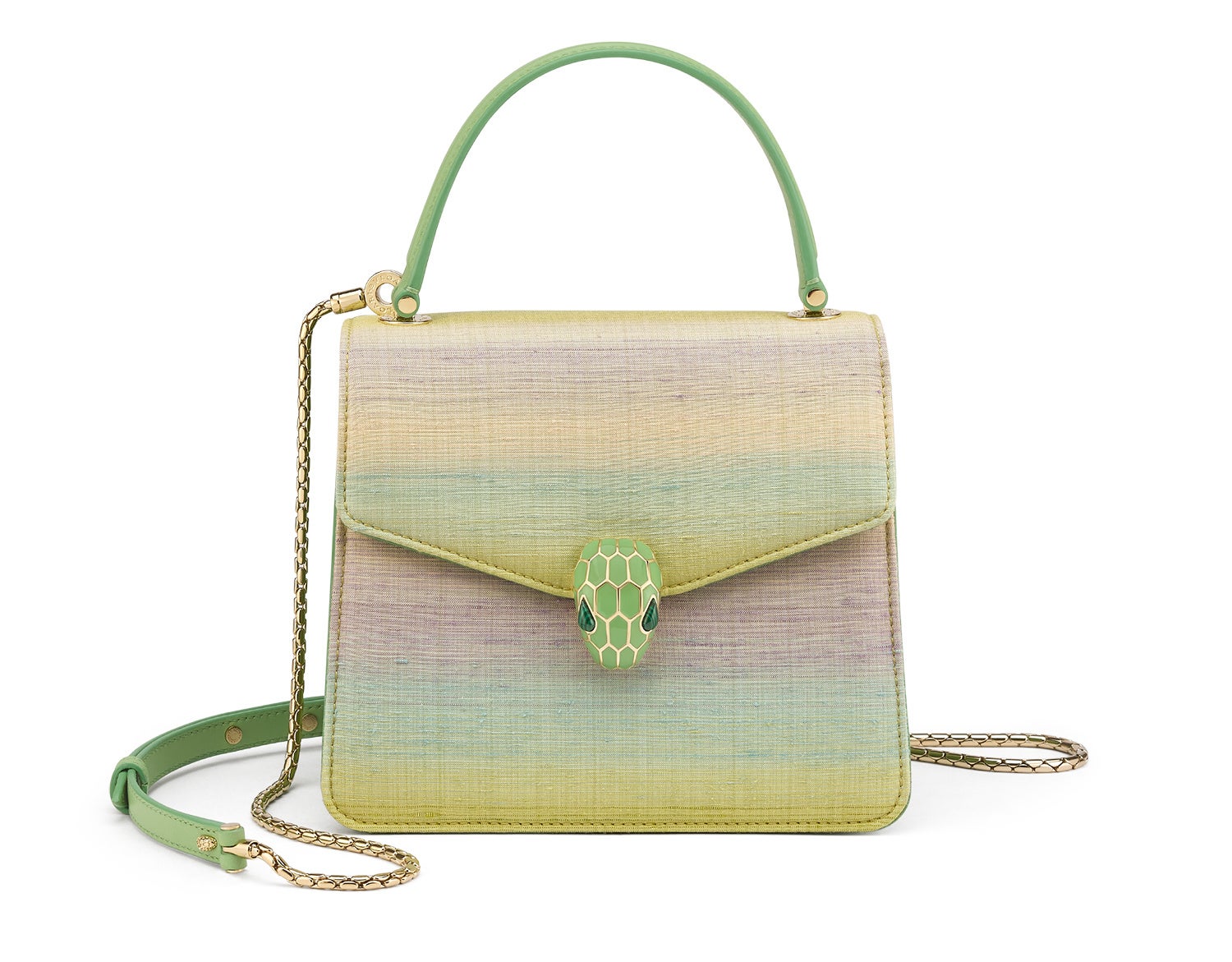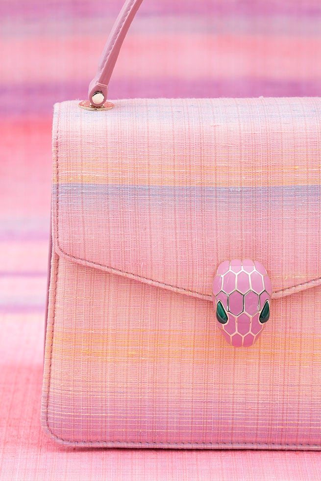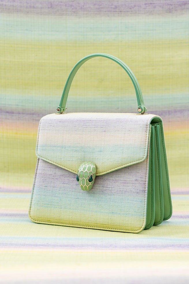 そして、京都からフィレンツェへ。京都の工房において手織りで織りあげられた優美な生地は、フィレンツェに構えるブルガリのアクセサリー&レザーグッズのアトリエに届き、メゾンの熟練した職人によって同系色のカーフレザーと共に巧みに組み合わされます。イエロー、ピンク、グリーンのエナメルのうろこと魅惑的なマラカイトの瞳をあしらった、スネークヘッドのクロージャー。紛れもないこのコレクションのアイコンが、壮大な色彩の詩にセルペンティの圧倒的な魅力を吹き込むのです。