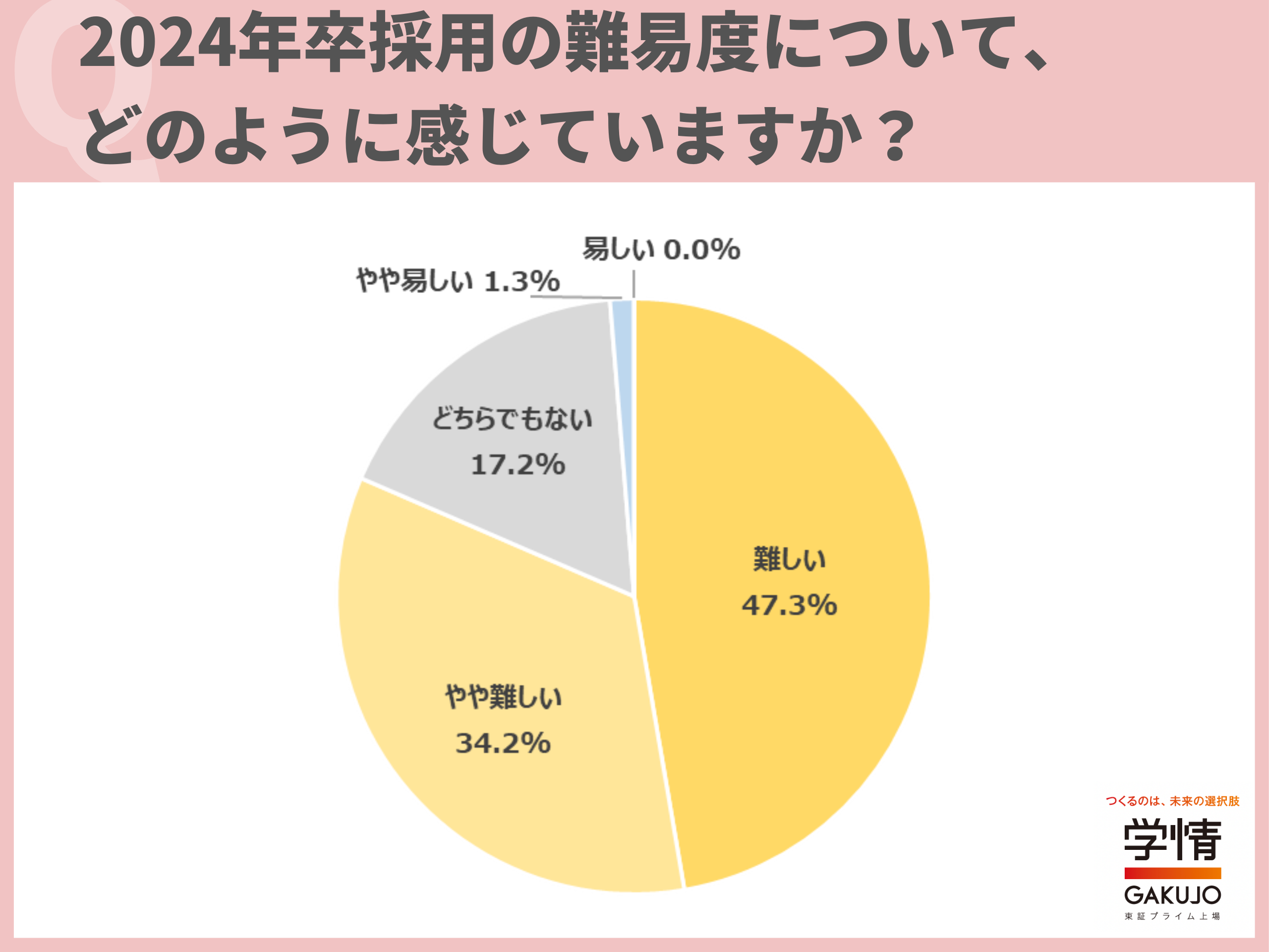 2024年卒採用では、3年生の3月末時点で「内定率」が5割に迫るなど、学生優位な売り手市場感が強まっています。企業は、2024年卒採用の難易度をどのように捉えているかアンケートを実施しました。