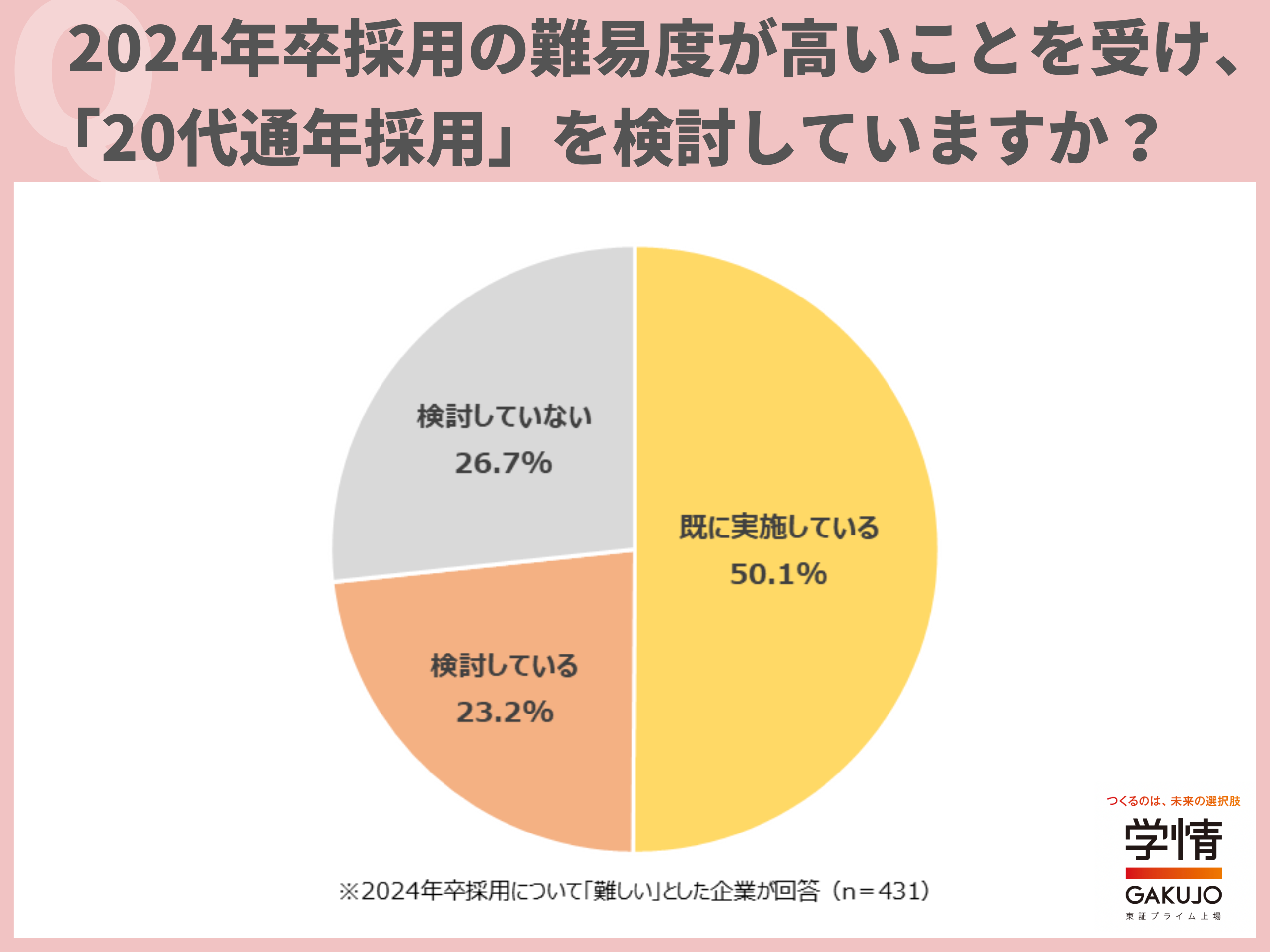 2024年卒採用の難易度が高いことを受け、既卒や第二新卒など20代を対象にした「20代通年採用」を「既に実施している」と回答した企業が50.1%に上りました。また、23.2%の企業が「検討している」としています。新卒採用の難易度が高くなっていることを受け、「20代通年採用」の導入に踏み切る企業や、導入を検討する企業が多いことが分かります。