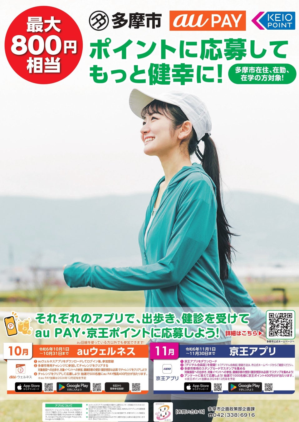 健康診断を受診したことの登録を必須条件に、多摩市にある対象施設(公民館や公園など)への出歩きや対象イベントの参加により京王アプリ上でスタンプを集め、アンケートに答えていただくと、抽選で1,000人の方に京王ポイント400円相当が当たります。