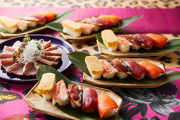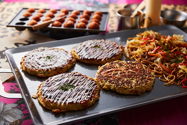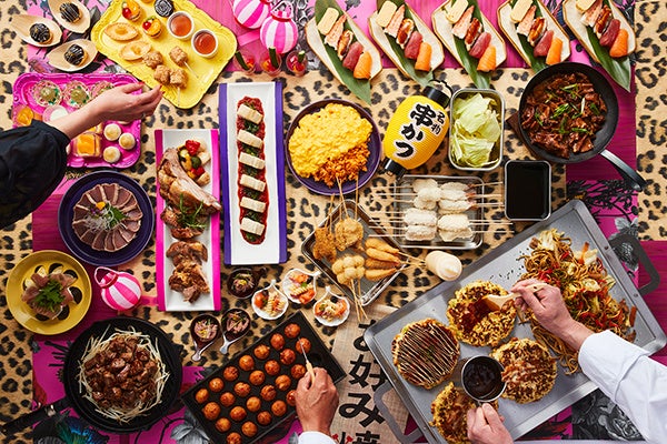 串かつ4種(牛、海老、うずら卵、エリンギ)、お好み焼き、たこ焼き、焼きそば、どて焼き、水なすと生ハム、キハダマグロのタタキ、ミックスジュースのババロア、パイナップル飴ヨーグルト、お好み焼き風ケーキ、串かつ風ガトーショコラ、みたらしプリン、冷やしあめタルト、など。