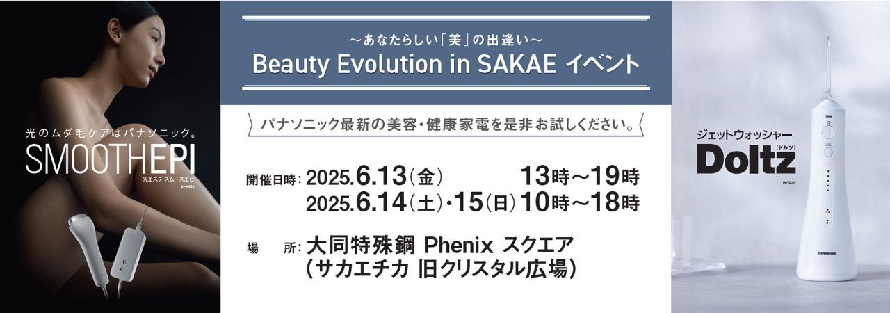 パナソニック株式会社は、2025年6月13日(金)~6月15日(日)の3日間、名古屋サカエチカにて、ジェットウォッシャー ドルツや光エステ スムースエピなど、パナソニックの最新理美容家電を体験できるポップアップイベントを開催します。