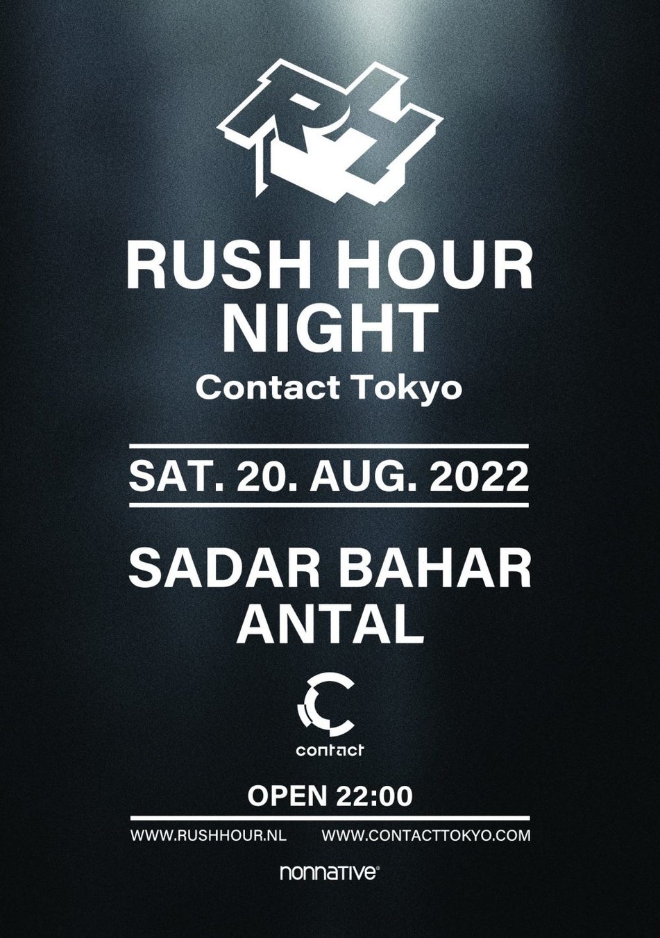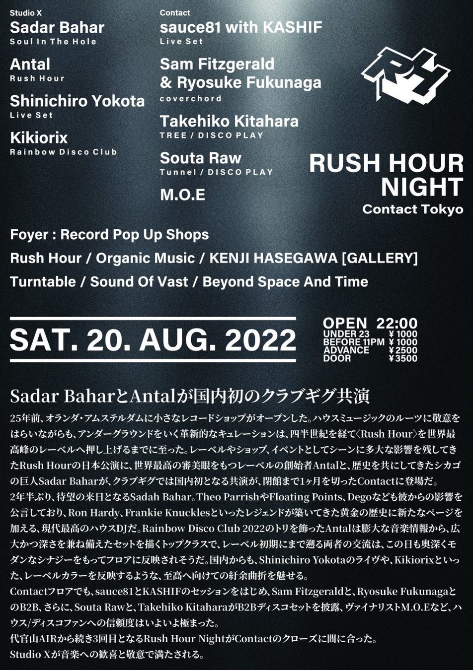 25年前、オランダ・アムステルダムに小さなレコードショップがオープンした。ハウスミュージックのルーツに敬意をはらいながらも、アンダーグラウンドをいく革新的なキュレーションは、四半世紀を経て〈Rush Hour〉を世界最高峰のレーベルへ押し上げるまでに至った。レーベルやショップ、イベントとしてシーンに多大な影響を残してきたRush Hourの日本公演に、世界最高の審美眼をもつレーベルの創始者Antalと、歴史を共にしてきたシカゴの巨人Sadar Baharが、クラブギグでは国内初となる共演が、閉館まで1ヶ月を切ったContactに登場だ。 2年半ぶり、待望の来日となるSadah Bahar。Theo ParrishやFloating Points、Degoなども彼からの影響を公言しており、Ron Hardy、Frankie Knucklesといったレジェンドが築いてきた黄金の歴史に新たなページを加える、名実ともに現代最高のハウスDJだ。Sadar Baharの制作やDJの構成は、他者のそれよりも音楽の深部を探っており、スピリチュアルなまでの要素を持っている。最も素晴らしいDJというのは最もレコードを掘っているはずで、世界屈指のディガーによって編み込まれる濃厚な時間は、依存度の高い絶対的な体験をオーディエンスに提供してきた。Rainbow Disco Club 2022の大トリを飾ったAntalは、6月、そのRDCが運営するレーベル〈Beyond Space And Time〉からキャリア初のコンピレーションアルバム「Beyond Space And Time 002」をリリース。膨大な音楽情報から、広大かつ深さを兼ね備えたセットを描くトップクラスで、レーベル初期にまで遡る両者の交流は、この日も奥深くモダンなシナジーをもってフロアに反映されそうだ。国内からの共演にも、寺田創一と並び創世記から今に至るまでジャパニーズハウスという概念を普及させたShinichiro Yokotaによるビンテージシンセサイザーを用いたライヴや、RUSH HOURとRainbow Disco Clubのコラボイベントでも抜擢されてきたKikiorixといった、レーベルカラーを反映するような、至高へ向けての紆余曲折を魅せる。 Contactフロアでも、sauce81のフィジカルな楽器演奏とボーカルに、Pan Pacific Playaや(((さらうんど)))のギターを務めてきたKASHIFとのセッションをはじめ、Francois. KやJames Murphy、Optimoといったハイクラスのサポートも務めてきたSam Fitzgeraldと、TNP.co.,ltdに所属し、アパレル業界でも屈指の音楽通として知られるRyosuke FukunagaとのB2B、さらに、アンダーグラウンドディスコのオーソリティSouta Rawと、DJ Noriとともに名パーティTreeを主催し過去のSadar Baharの招聘に携わってきたTakehiko KitaharaがB2Bディスコセットを披露、国産ハウスラジオ局Tsubaki FMにも度々登場してきたヴァイナリストM.O.Eなど、ハウス/ディスコファンへの信頼度はいよいよ極まった。 代官山AIRから続き3回目となるRush Hour NightがContactのクローズに間に合った。Studio Xが音楽への歓喜と敬意で満たされる。