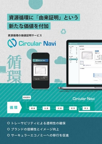 「Circular Navi」は企業活動における循環型サプライチェーンのトレーサビリティーや再資源化率の可視化など、サーキュラーエコノミーの実現に向けた取り組みを製品ごとに環境価値として証明するクラウドサービスです。