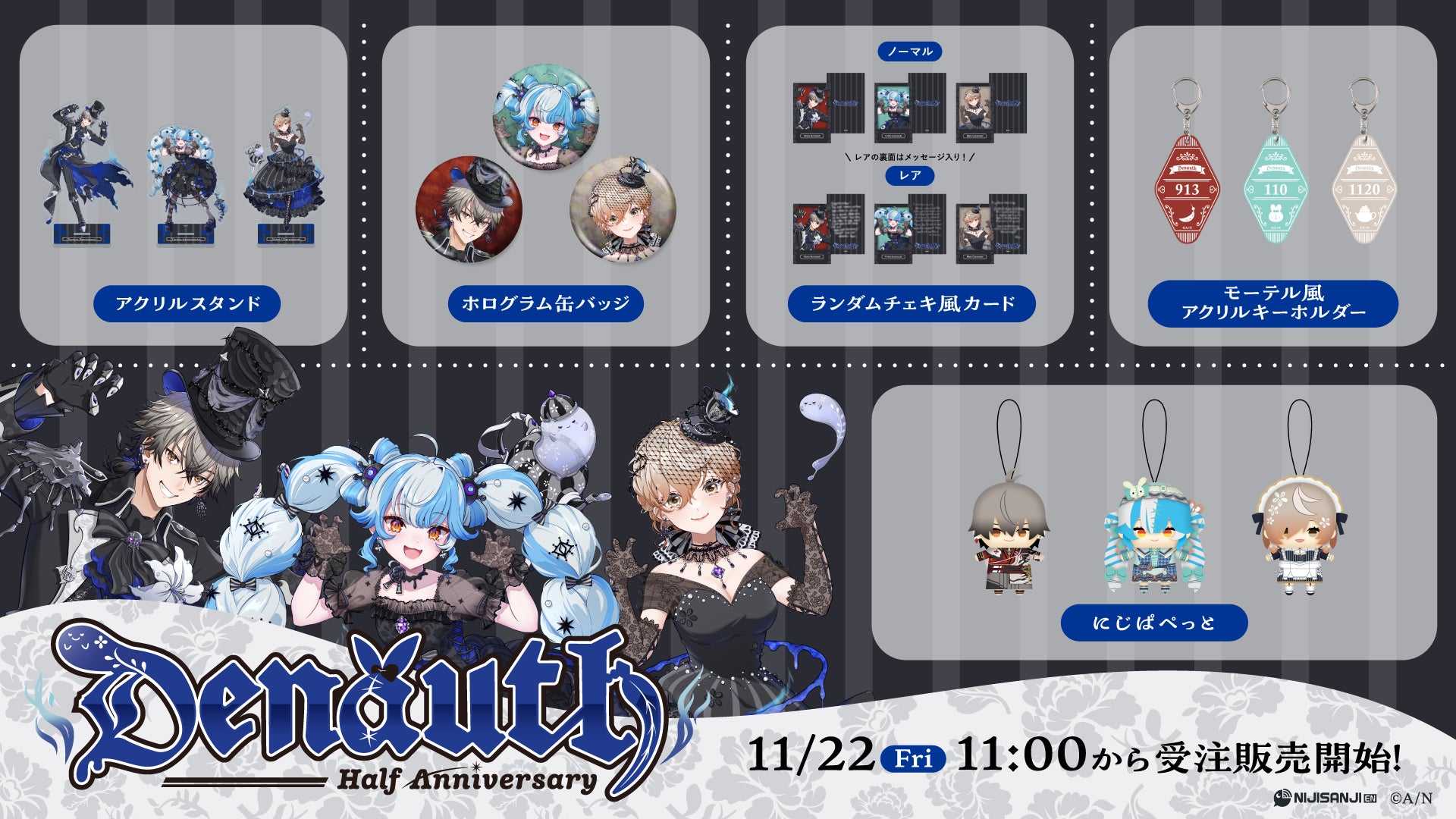 「Denauth Half Anniversary」は、2024年11月22日(金)11時(JST)から、にじさんじオフィシャルストア(https://shop.nijisanji.jp/)とNIJISANJI EN Official Store(https://nijisanji-store.com/)にて受注販売を開始いたします。
