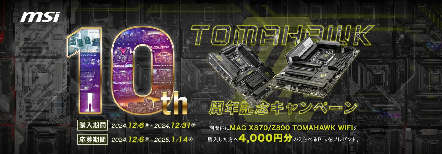この度、エムエスアイコンピュータージャパン株式会社は、12月6日(金)より、MAG X870 TOMAHAWK WIFI または MAG Z890 TOMAHAWK WIFIを購入してキャンペーンに応募すると4,000円分のえらべるPayがもらえる「TOMAHAWK10周年記念キャンペーン」を開催いたします。