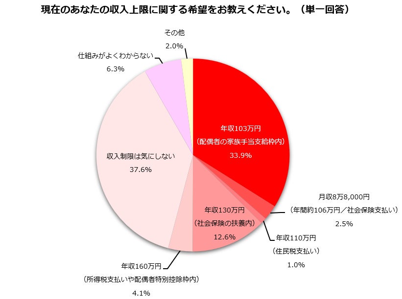 最低賃金が全国で1,000円を超えたり、所得税支払いの下限額が160万円になったりと目まぐるしい変化が起きている昨今。仕事と家庭の両立を希望する主婦・主夫層に「現在のあなたの収入上限に関する希望をお教えください」と尋ねたところ「収入制限は気にしない」が37.6%と最も多かったものの、何らかの収入上限を設定している人が過半数でした。収入上限額の最多は、「年収103万円」で33.9%。配偶者の家族手当支給要件になっているケースが少なくない一方、“103万円”という金額の印象の強さから、とりあえず上限に設定している人もいるのかもしれません。
