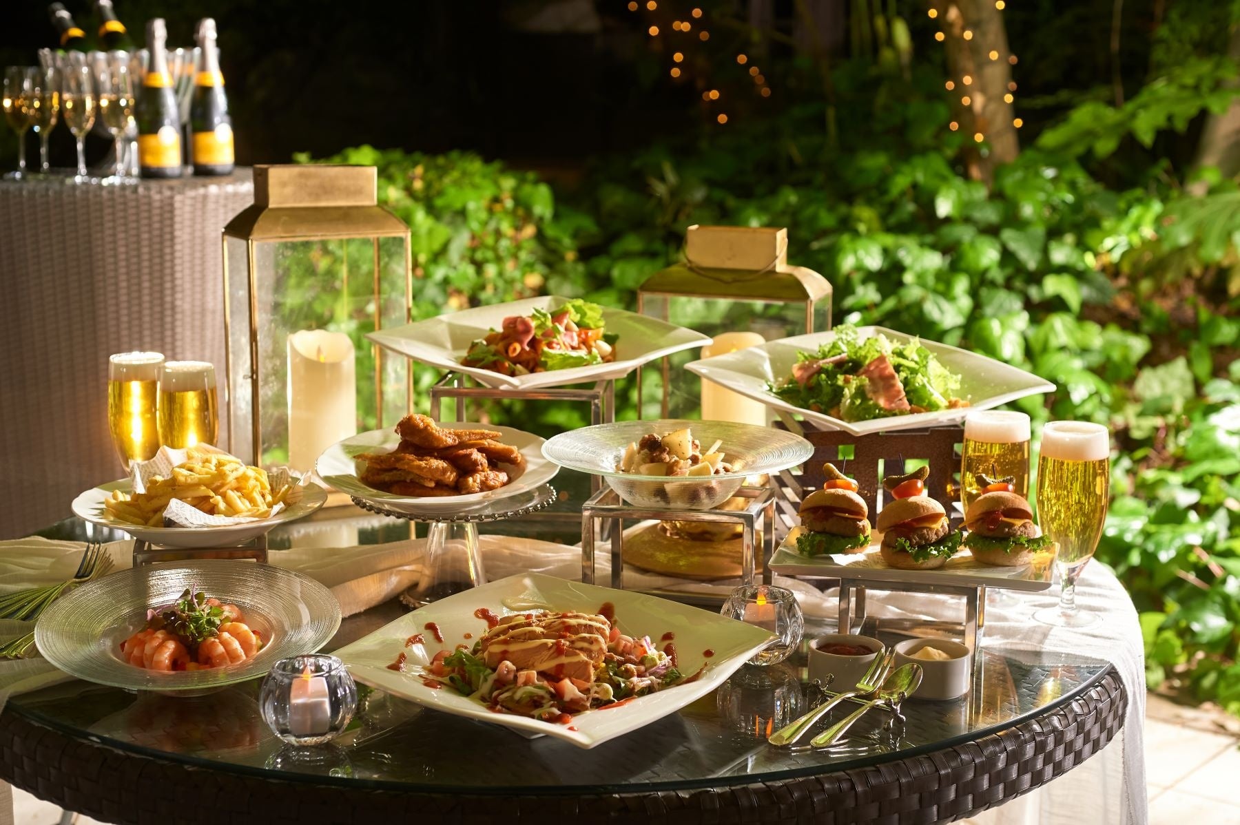 テーマは、『 New Yorkers Forest(ニューヨーカーズフォレスト)』。大きな窓から緑豊かなガーデンを臨む室内の食事会場で、ニューヨーク発祥のバッファローウィングチキン、アメリカンファストフードの定番・ミニハンバーガーとフライドポテト、ニューヨーカーに人気のオーバーライス、カクテルシュリンプ、ウォルドルフサラダといったボリューム満点のアメリカンディナーを、ビールやワイン、カクテルなどのフリーフローとともにご堪能いただけます。