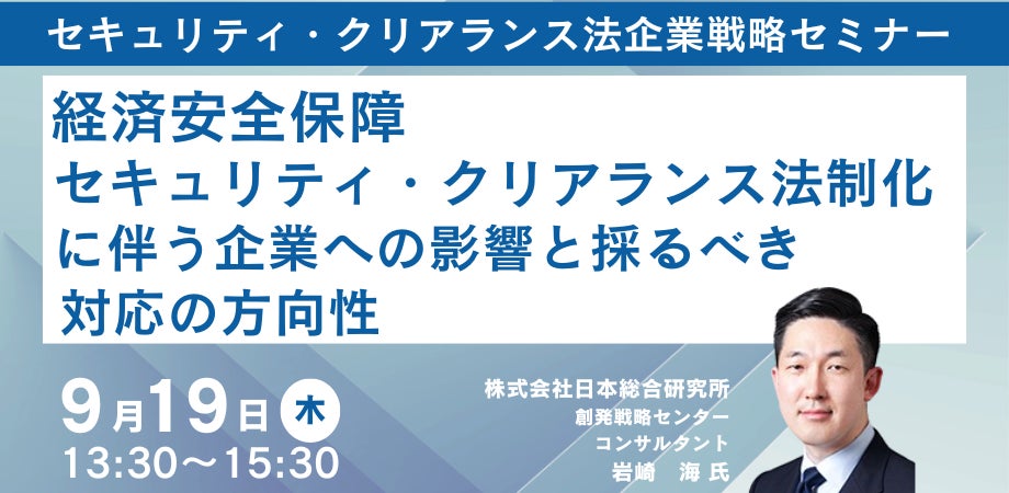 JPI(日本計画研究所)は、株式会社日本総合研究所 創発戦略センター コンサルタント 岩崎 海 氏を招聘し、セキュリティ・クリアランス法制化に伴う企業への影響と採るべき対応の方向性について詳説いただくセミナーを開催します。