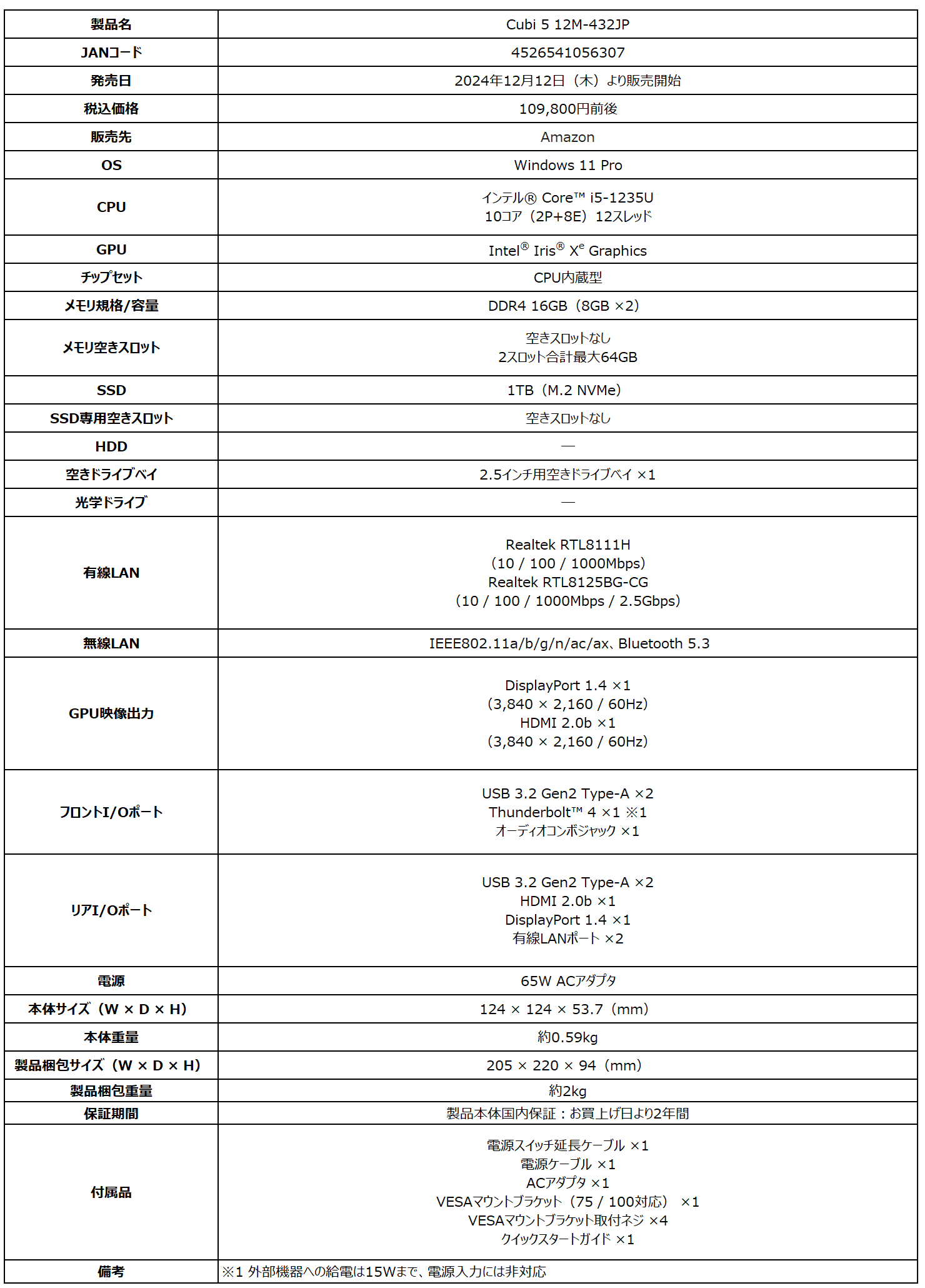 Thunderbolt™ 4搭載ミニPC VESAマウント・最大3画面のマルチモニターに対応 Amazon限定モデル「Cubi 5 12M-432JP」発売
