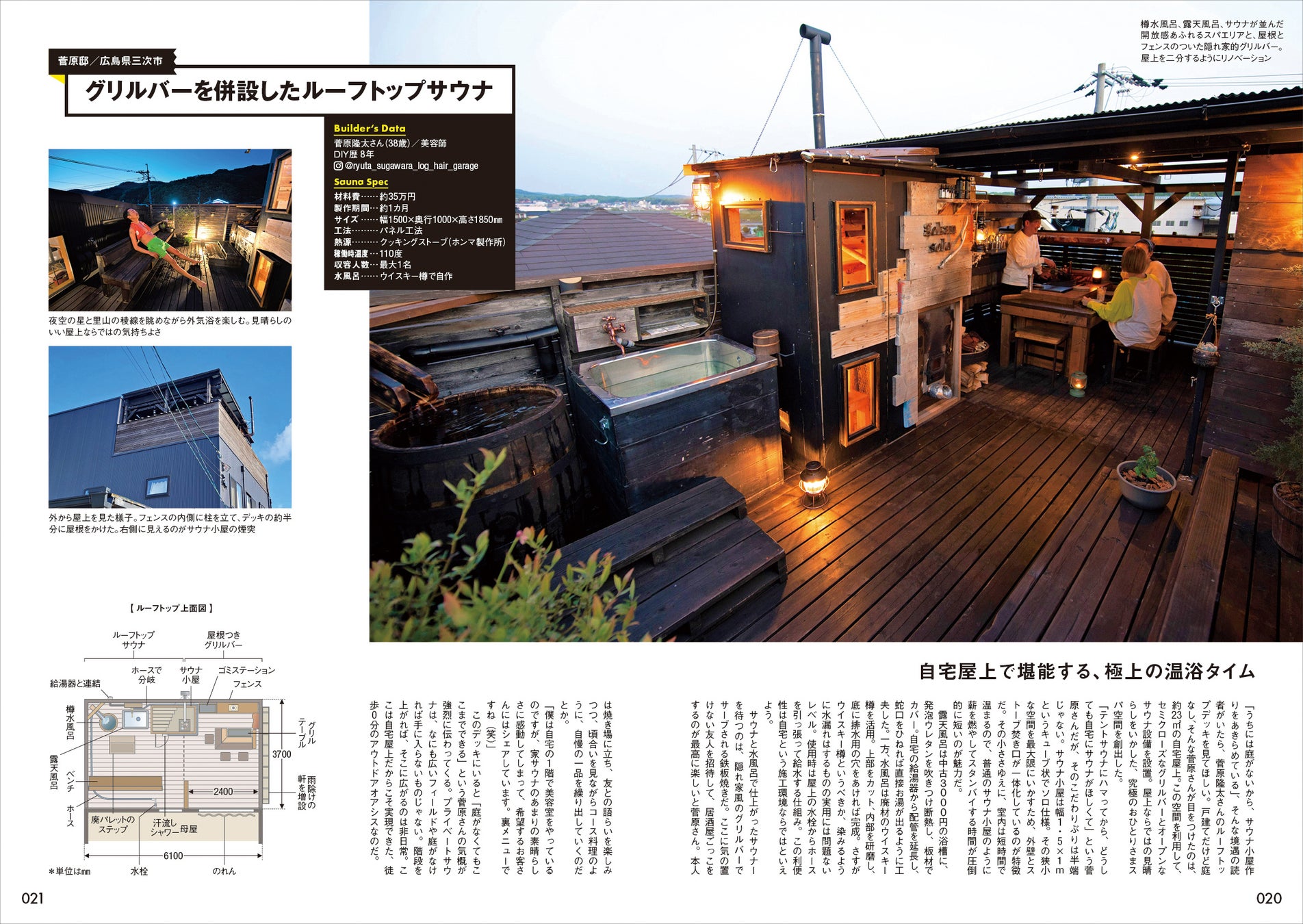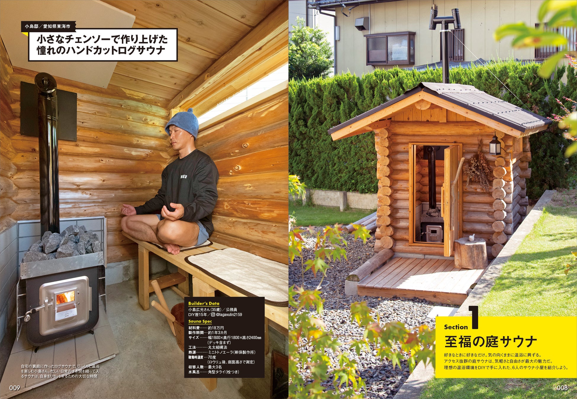 本邦初のサウナビルド指南書『Sauna Builder(2021)』発売から4年。当時はネットを検索しても見つからなかったDIYサウナが続々登場。さまざまなビルダーがサウナへの偏愛っぷりを炸裂させながら、自分だけのサウナビルドの様子を発信している。本書は、そんな手作りサウナのさまざまな事例と製作ノウハウを詳細にまとめたDIYガイドブック。“サウナ作りのバイブル”が登場です!