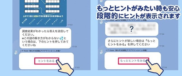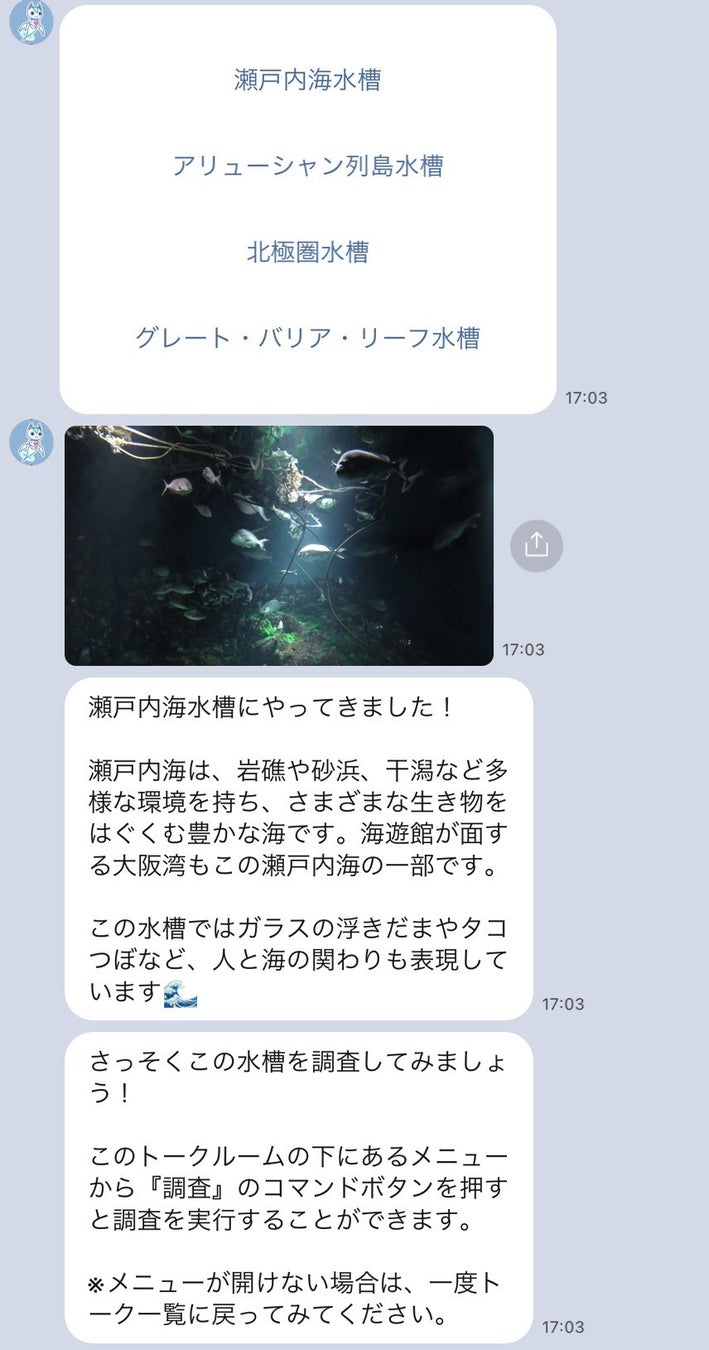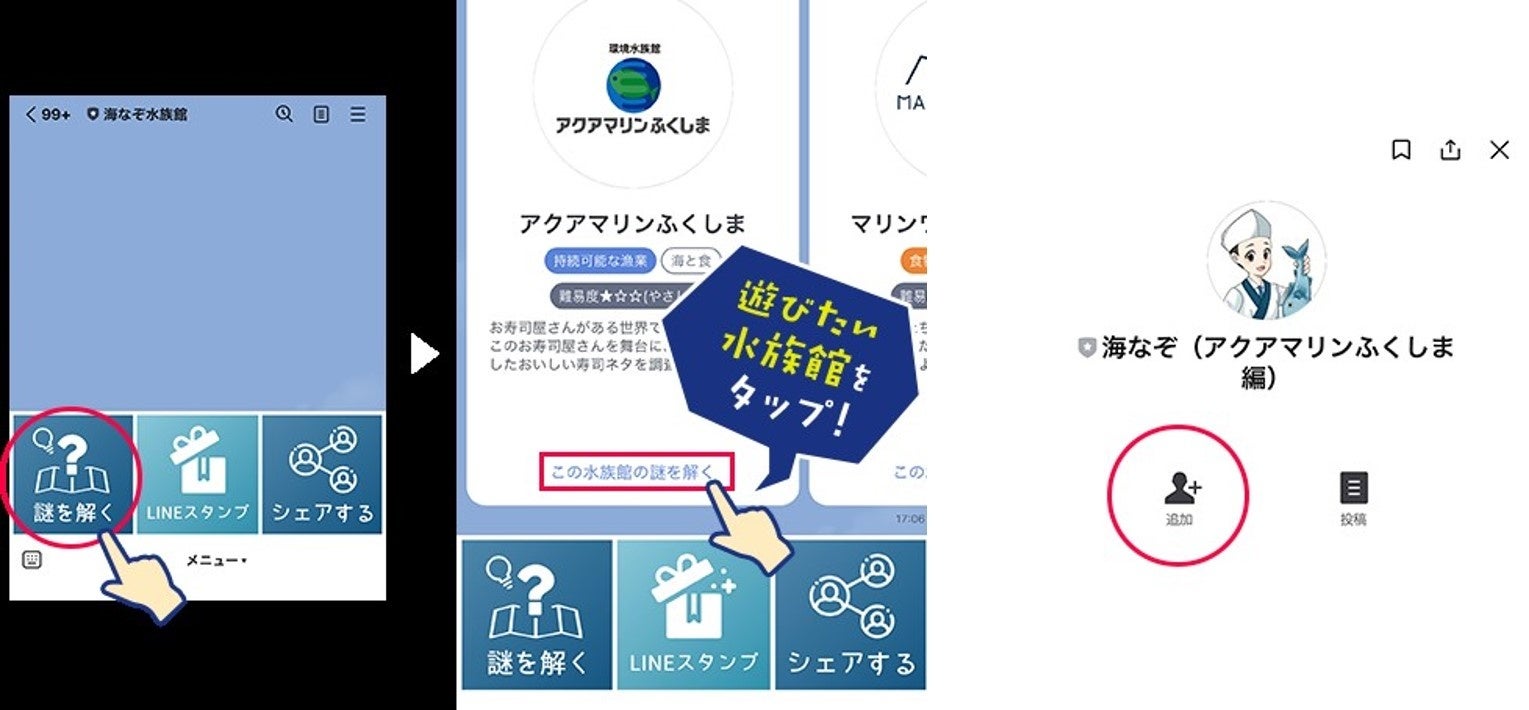 ▼「海なぞ水族館」のLINE公式アカウントから遊びたい水族館を選ぶと、専用のゲームアカウントで謎解きをプレイすることがきます。