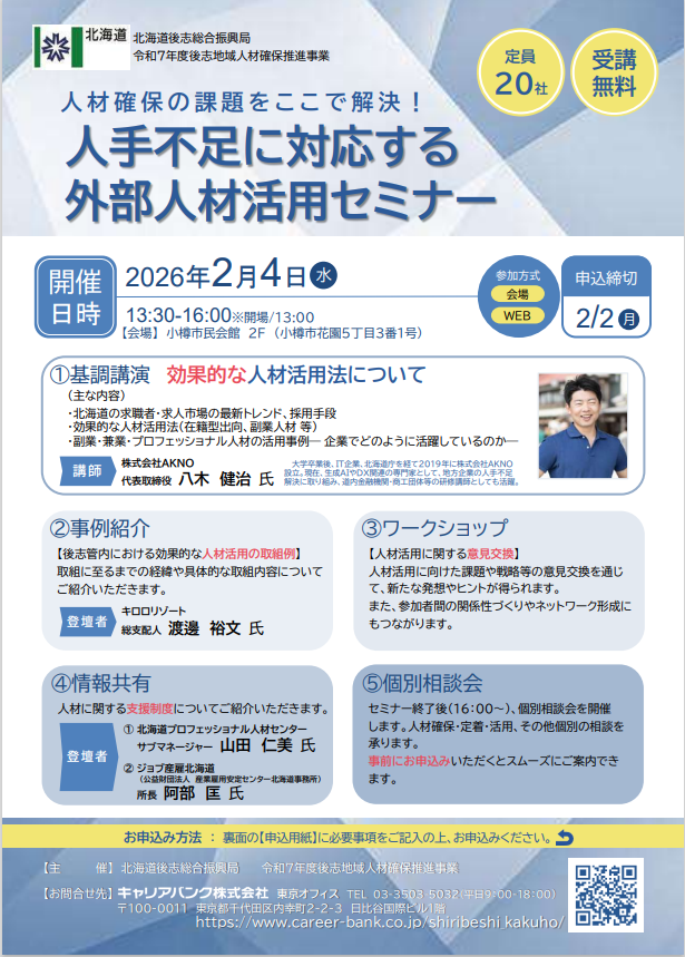 北海道後志総合振興局では、この度、事業者のみなさまを対象に、外部人材の活用を目的としたセミナーを開催いたします。