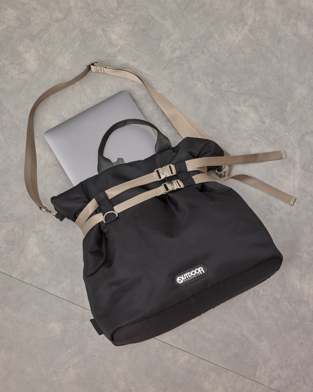 「OUTDOOR PRODUCTS」のアイコンバッグに、「NERGY」らしいセンシュアルスポーティーなディテールを落とし込んだ上部のベルト部分がワンポイント。A4ファイルやPCがすっぽり入るサイズ感と、ハンドバッグとショルダーバッグの仕様で、アウトドアや通勤など、シーンを問わず活躍します。また、微光沢で高級感のあるナイロン素材に撥水加工を施し、雨や汗、汚れにも強い、タフなバッグに仕上げました。