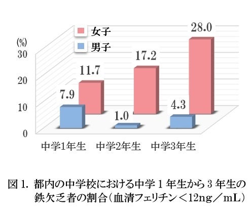 一般的に鉄欠乏状態と判定される血清フェリチンが12ng/mL未満の女子中学生の割合は、1年生が11.7%、2年生は17.2%、3年生では28.0%となり、学年が上がるとともに鉄欠乏と判定された学生が増加しました(図1)。