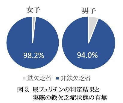 「鉄欠乏疑い無し」と判定された学生のうち、血清フェリチンの測定でも鉄欠乏状態でないと判定された「非鉄欠乏者」の割合(陰性的中率8))は、女子学生で98.2%、男子学生で94.0%と高値となりました(図3)。これにより、血清と尿のそれぞれの陰性判定には大きな乖離はないことが分かりました。