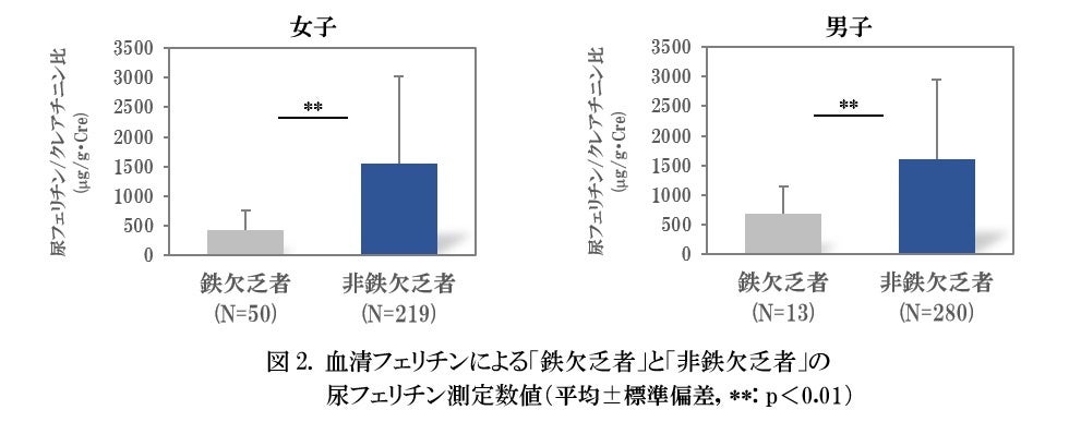 次に、尿検査でも鉄欠乏状態の有無の推定が可能か確認しました。血清フェリチン12ng/mL未満を「鉄欠乏者」、それ以上を「非鉄欠乏者」とし、男女別に「鉄欠乏者」と「非鉄欠乏者」それぞれの尿フェリチン測定数値を調べました。その結果、男女ともに「鉄欠乏者」は「非鉄欠乏者」に比べ、尿フェリチンの平均値が有意に低いことが分かりました(図2)。