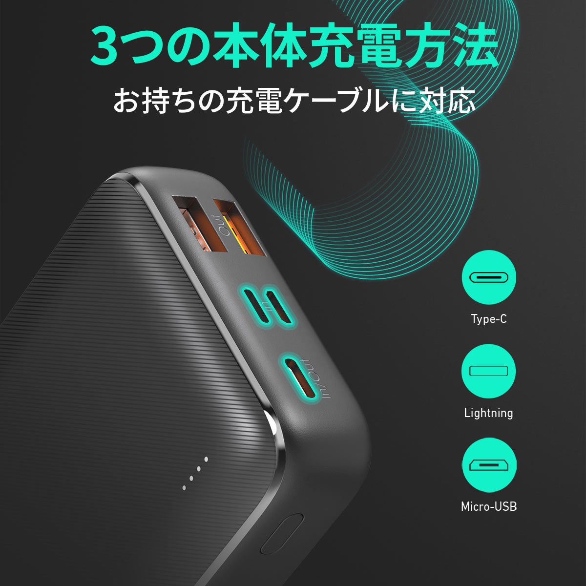 旅行先や出張の際にもかさばらず、2種類の出力ポートでお持ちのさまざまな機器を安心して充電していただくことが可能です。Lightning、USB-C、Micro-USBの3種類の入力ポートを搭載し、モバイルバッテリー用とスマートフォン用に別々の充電ケーブルを持ち運ぶ必要はありません。
