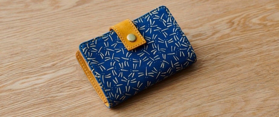 表は鹿革の鮮やかなブルーに漆のホワイトが映え、裏はイタリアンレザー「プエブロ」のイエローが存在感を放つカラフルモデル。それでいて上質な甲州印伝をまとうことで、カジュアルになりすぎない落ち着きも兼ね備えています。
