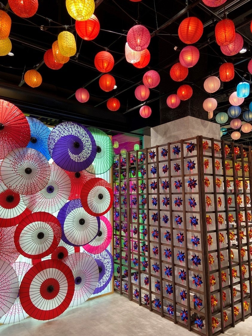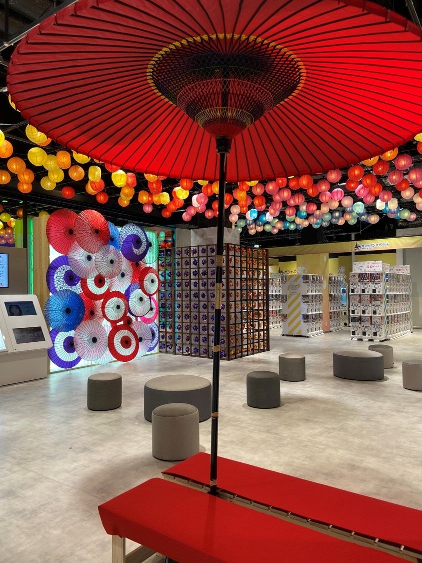 期間中、世界最大級※1である40台のプリントシール機がずらりと並ぶ店内に、天井を華やかに彩る提灯(ちょうちん)装飾や、野点傘(のだてかさ)の置かれた休憩用の腰掛け、和傘や風車(かざぐるま)を背景にして写真が撮れるフォトスポットを設置し、お祭りのような空間を演出します。(※1…2023年6月現在。当社調べ。)