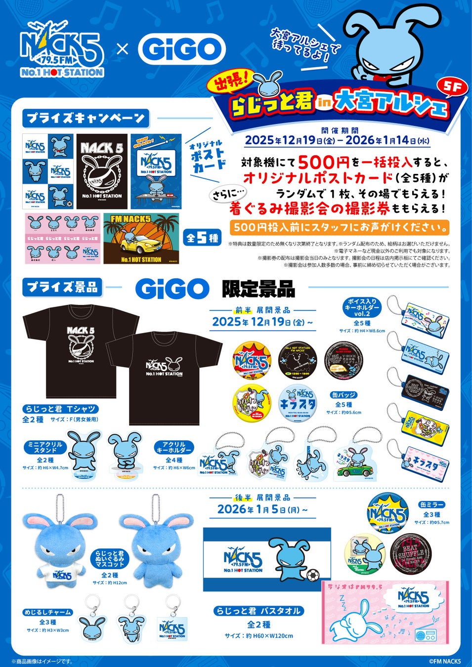 株式会社GENDA GiGO Entertainment(本社:東京都港区 代表取締役社長:二宮 一浩、以下「当社」)は、当社が運営する「GiGO大宮アルシェ」にて、2025年12月19日(金)より、首都圏を中心に放送しているFMラジオ局「FM NACK5」とのポップアップイベントを開催いたします。