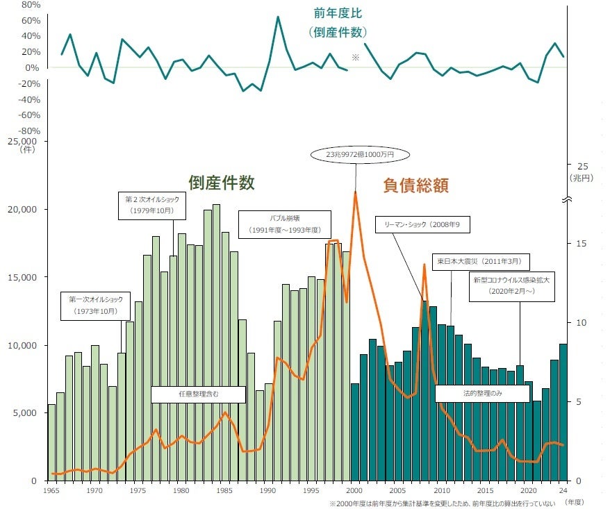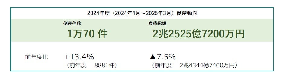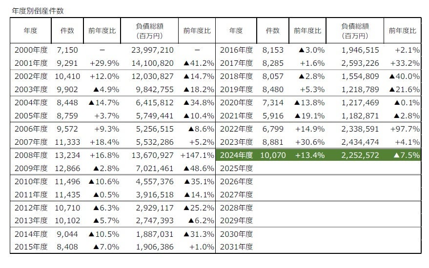 2024年度の倒産件数は1万70件(前年度8881件、13.4%増)となり、3年連続で前年度を上回った。2013年度(1万102件)以来、11年ぶりに1万件を超えた。負債5000万円未満の倒産が2000年度以降で最多となるなど、中小零細規模の倒産が増加した