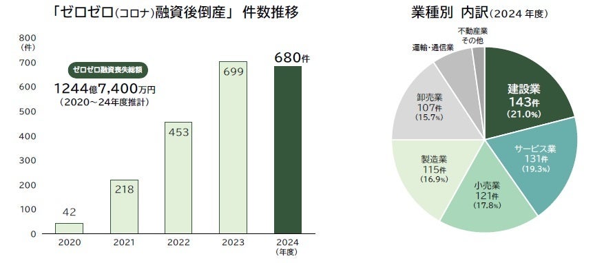 「ゼロゼロ(コロナ)融資後倒産」は、680件(前年度699件、2.7%減)判明し、集計開始後初めて前年度を下回った。業種別では、『建設業』(143件)が最も多く、『サービス業』(131件)、『小売業』(121件)が続いた。「不良債権(焦げ付き)」に相当するゼロゼロ融資喪失総額は推計で約1244億7400万円にのぼった。