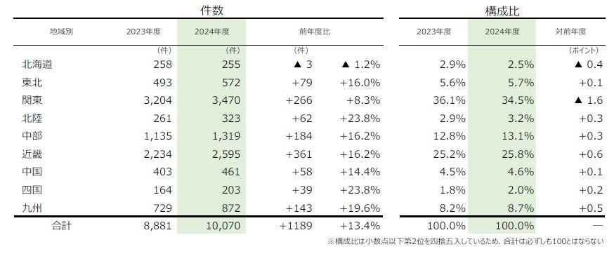 地域別にみると、9地域中8地域で前年度を上回った。また、『北海道』を除く8地域が過去10年で最多となった。最も件数が多かったのは、『関東』(前年度3204件→3470件、8.3%増)。次いで、『近畿』(同2234件→2595件、16.2%増)が続き、「大阪」(同1111件→1351件)が前年度を240件上回り、全体を押し上げた。