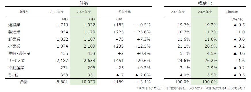 業種別にみると、全業種で前年度を上回った。また、『建設業』『製造業』『小売業』『運輸・通信業』『サービス業』『不動産業』の6業種は、過去10年で最多となった。『サービス業』(前年度2187件→2638件、20.6%増)が最も多く、『小売業』(同1874件→2109件、12.5%増)、『建設業』(同1749件→1932件、10.5%増)と続いた。『サービス業』は、ソフトウェア開発などの「広告・調査・情報サービス」(同711件→871件)が大幅に増加し、2000年度以降で最多となった。『製造業』(同954件→1179件、23.6%増)は、7年ぶりに1000件を超えた。