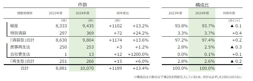倒産態様別にみると、『清算型』倒産の合計は9804件(前年度8630件、13.6%増)となった。全体の97.4%を占め、構成比は2000年度以降で最も高くなった。『再生型』倒産は266件(同251件、6.0%増)発生した。